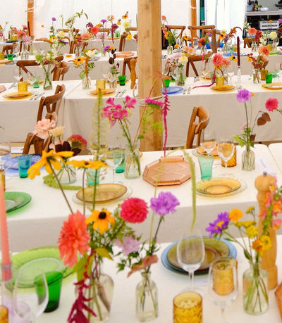Le mélange de vaisselle ajoute une note festive et joyeuse, le tout dans un cadre verdoyant, où les tons blancs et crèmes du plafond harmonisent l'ensemble.